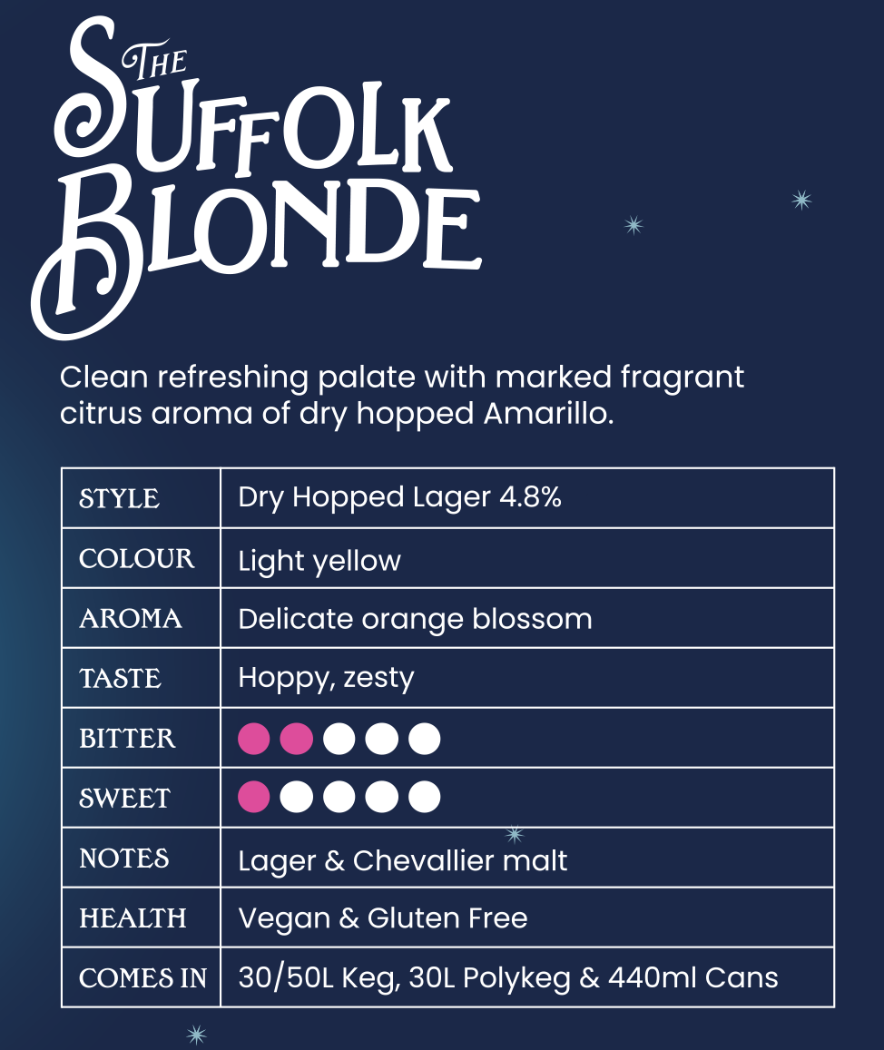 Suffolk Blonde is a clear golden lager with a marked fragrant citrus aroma. With a clean and refreshing palate, it is light in body with a deceptively assertive flavour. The Suffolk Blonde has excellent balance, and is particularly refreshing and sessionable.